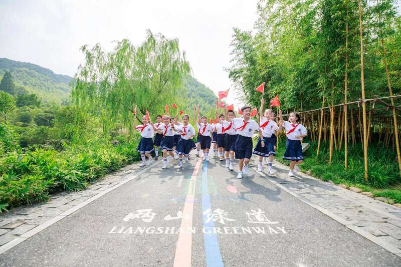 六一前夕,少先队员参加“沿着习爷爷的足迹 寻访美丽余村”红色研学实践活动,奔跑在余村的两山绿道上。(共青团安吉县委、安吉县少工委供图)