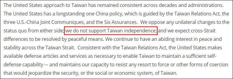 “美台关系事实清单”加回“美国不支持台独”表述 截图自美国国务院网站