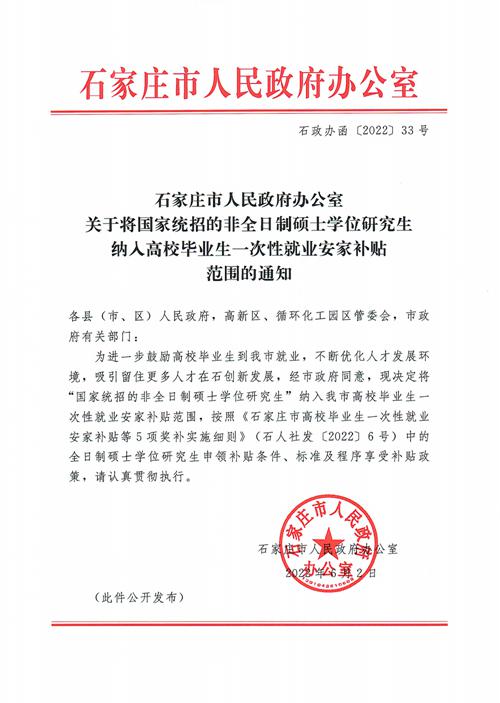 为进一步鼓励高校毕业生到我市就业,不断优化人才发展环境,吸引留住更多人才在石创新发展,经市政府同意,现决定将“国家统招的非全日制硕士学位研究生”纳入我市高校毕业生一次性就业安家补贴范围,按照《石家庄市高校毕业生一次性就业安家补贴等5项奖补实施细则》(石人社发[2022]6号)中的全日制硕士学位研究生申领补贴条件、标准及程序享受补贴政策,请认真贯彻执行。