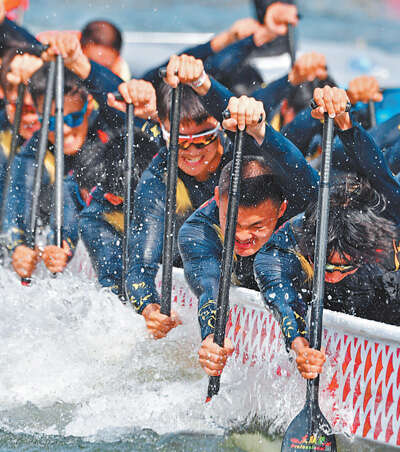 6月2日,参赛选手在海峡两岸赛龙舟活动中奋力划桨。 新华社记者 魏培全摄