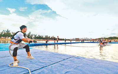 6月2日,海峡两岸赛龙舟活动现场,集美大学龙舟队在龙舟拔河比赛中。 新华社记者 林善传摄