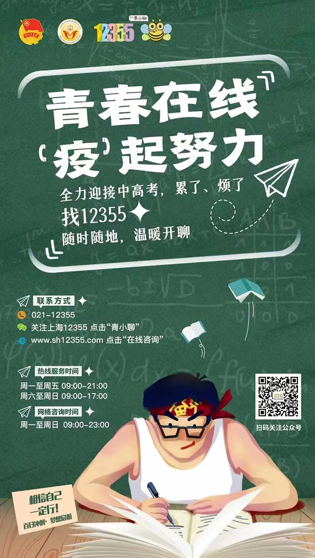 当出现焦虑不安、情绪困扰、学习压力、亲子矛盾、应激反应等问题时,欢迎拨打021—12355进行热线咨询,多位专业心理咨询师,为您解答心理困惑!或点击“青小聊”进行网络咨询,随时随地进行网络咨询,更多上海12355暖心师在线陪伴守候、聆听您的诉说!