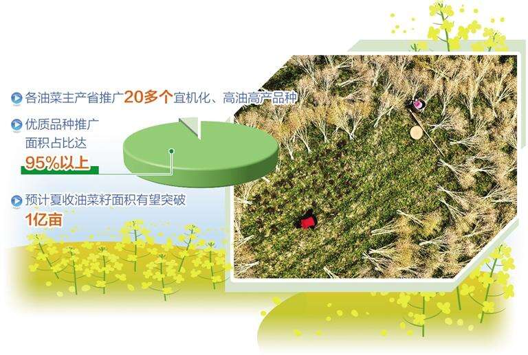 中央财政今年安排产油大县奖励、耕地轮作、绿色高质高效行动等项目资金30多亿元专项支持油菜生产,有效调动了地方政府重农抓油和农民务农种油的积极性。各油菜主产省压实油菜扩种任务,确保政策资金落实到位,大力推广20多个宜机化、高油高产品种,初步统计优质品种推广面积占比达95%以上。据农业农村部农情调度,预计夏收油菜籽面积有望突破1亿亩。
