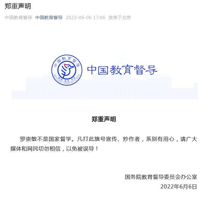 中新网6月6日电 据“中国教育督导”微信公众号消息,国务院教育督导委员会办公室6日发布声明称,罗崇敏不是国家督学。凡打此旗号宣传、炒作者,系别有用心,请广大媒体和网民切勿相信,以免被误导。