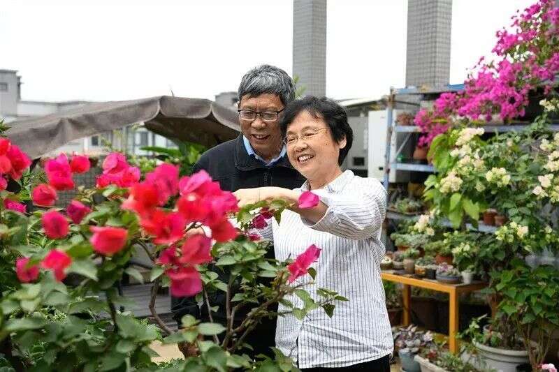 ▲5月27日,黄正中(后)和戴虹(前)在家里修剪花枝
