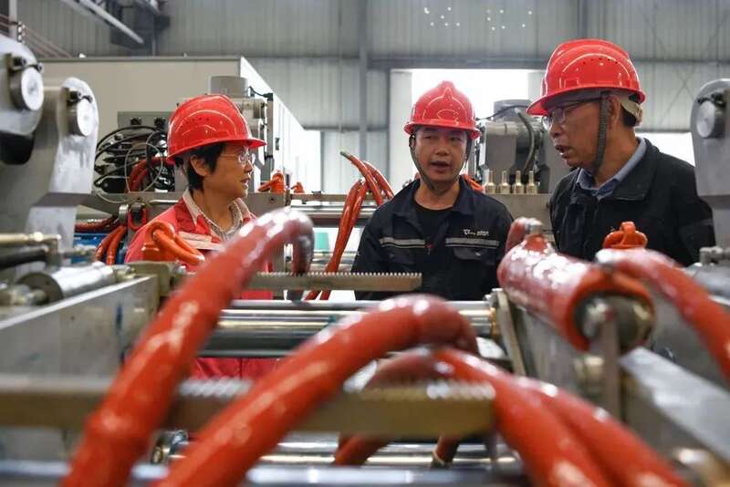 ▲5月27日,戴虹(左)与黄正中(右)在装配车间内向工人了解近期装配情况