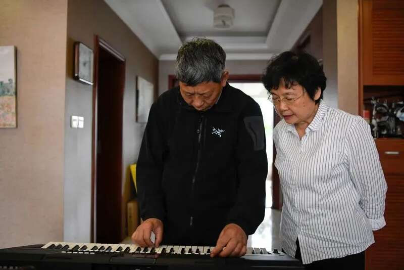 ▲5月27日,黄正中(左)与戴虹(右)研究新买的电子琴