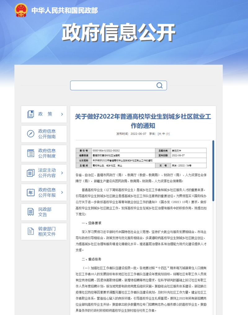 中国青年报客户端北京6月7日电(中青报·中青网记者 先藕洁)民政部、教育部、财政部、人力资源和社会保障部近日联合印发了《关于做好2022年普通高校毕业生到城乡社区就业工作的通知》(以下简称《通知》),从加强社区工作者队伍、发展城乡社区服务业、创新工作联动机制、开发就业见习岗位、加强高校毕业生教育引导等5个方面,拓宽高校毕业生到城乡社区就业创业渠道。