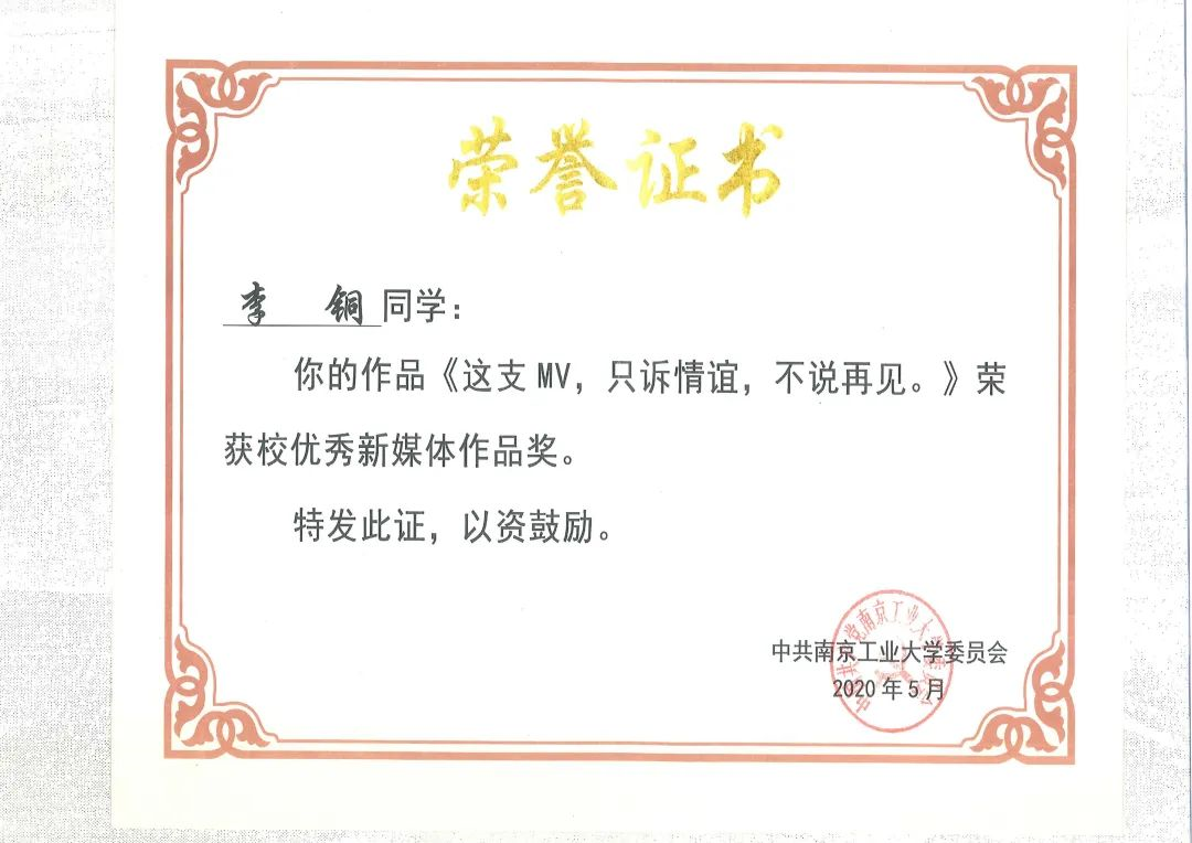 在筹划2019年毕业MV时,李铜和他的团队提前两个多月便开始讨论故事框架、拍摄方案、选角等事宜,整个拍摄过程持续了近两个月时间。而在拍摄过程中,他也遇到了许多困难:比如因选角原因而不得不对影片中大量已经完成的部分重新拍摄;其他种种原因导致拍摄团队的人数一再减少,从最初的十几人到最后只剩下四五人;甚至在准备过程中,片子一度面临被淘汰的境况……在克服了重重阻碍后,《这支MV,只述情谊,不说再见》的视频在官微、官博和B站上成功上线,取得了很好的反响,后来还被评为校“2019优秀新媒体作品”。