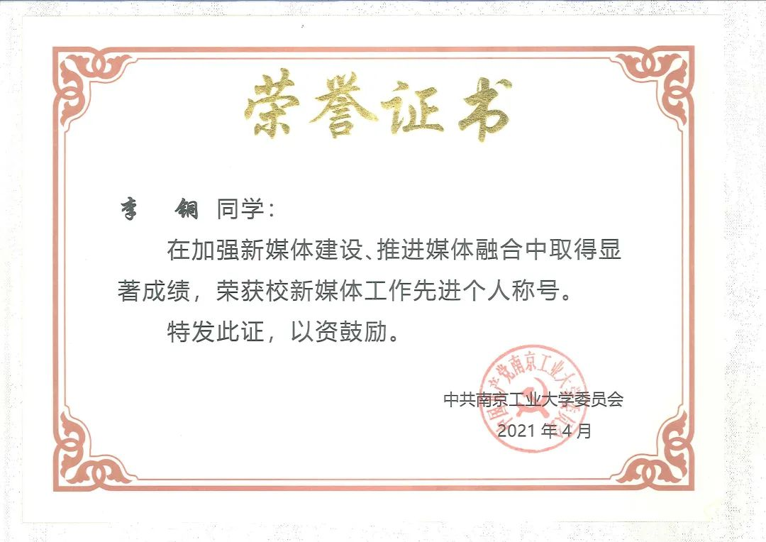在成为电视台新一任负责人期间,李铜尽己所能地帮助和指导团队新人。同时,自己也依旧在制作高质量作品的道路上高歌猛进,统筹完成了“南京工业大学第六届马拉松”“2021新年音乐会”等直播工作并完成了包括“南工大雪景再上热搜”在内的多个推送视频,均收获了不错的浏览量。