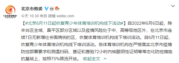 自2022年6月6日起,除丰台区全域、昌平区部分区域以及疫情风险处于中、高等级地区外,在北京市连续7日无新增社会面病例的区,恢复体育培训机构线下培训活动。自6月11日起,恢复青少年体育培训机构线下培训活动。各体育培训机构在严格落实北京市疫情防控部署要求和测温扫码、查证和查验72小时内核酸阴性证明等常态化防控措施的基础上,按照75%限流开放。
