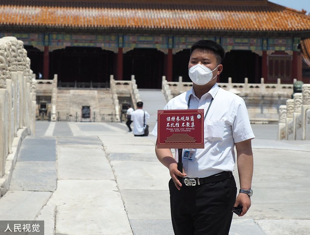 2022年6月7日,北京,故宫博物院内,工作人员手持防控提示牌,提醒游客做好防护。