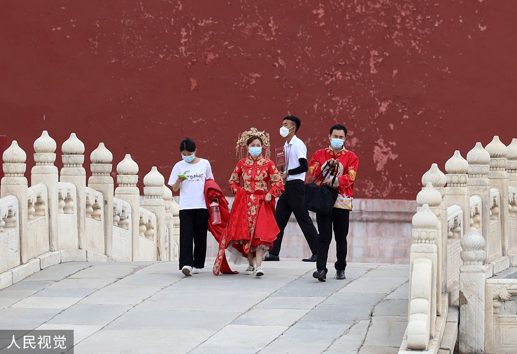 2022年6月7日,北京,闭馆26天后,北京故宫博物院按照75%限流要求恢复开放。开放首日现场游客较少,有游客在故宫内拍古装照。