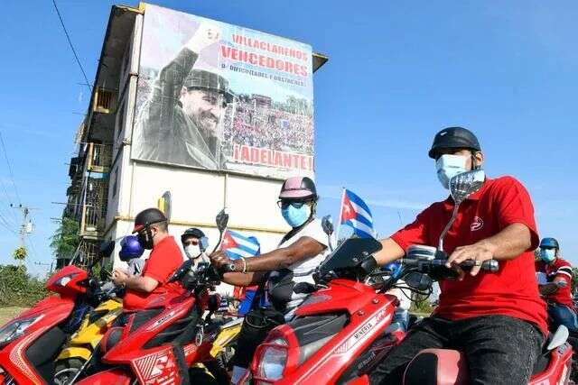 ▲人们骑摩托车在古巴中部城市圣克拉拉参加游行