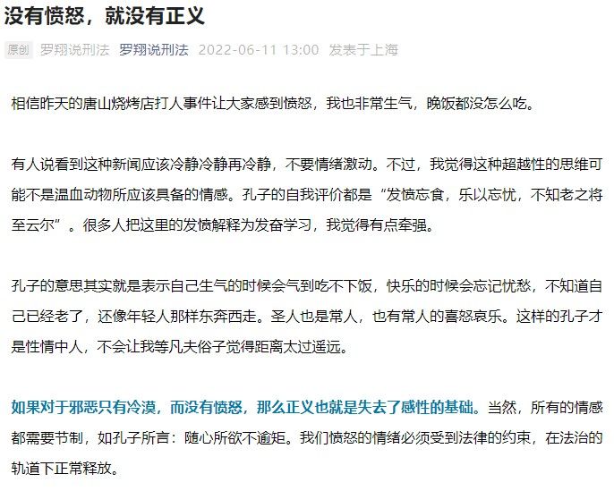 他写道:“我们为什么对此类案件愤怒,因为我们都是血肉之躯,同情他人就是同情自己。我们希望法律能够保护我们,让我们不至于成为下一个热点事件的被害人,被人伤害与侮辱。”“如果对于邪恶只有冷漠,而没有愤怒,那么正义也就是失去了感性的基础。当然,所有的情感都需要节制……我们愤怒的情绪必须受到法律的约束,在法治的轨道下正常释放。”
