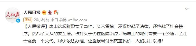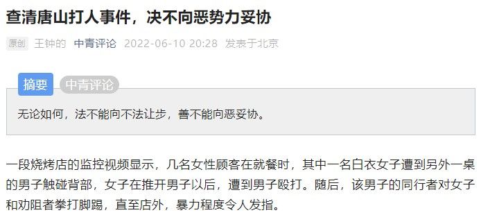 正如中青评论在《查清唐山打人事件,决不向恶势力妥协》一文中指出的:“无论如何,法不能向不法让步,善不能向恶妥协。”“对于直接掌握法律公器的执法者来说,最好的办法就是在第一时间揪出惩办恶势力。”让打人者依法受到严惩,为自己目无法纪、毫无道德的恶行付出代价,是全社会的共同呼声。