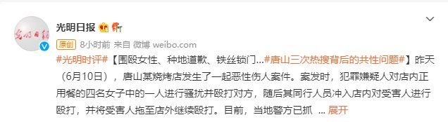 在愤怒之后,在不法者被依法严惩的同时,还有更多深层问题值得被反思。在光明日报评论文章《围殴女性、种地道歉、铁丝锁门:唐山为何一个月三次热搜?》中,就直指当地的社会治理环境问题。