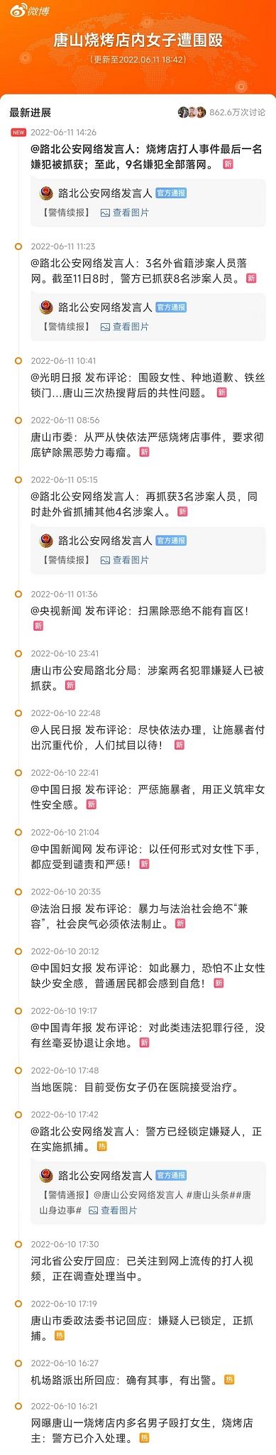 6月11日下午,据唐山警方通报,烧烤店打人案件最后一名外省籍涉案人员在江苏已被抓获,九名涉案人员已全部归案。