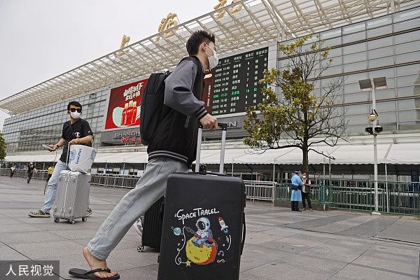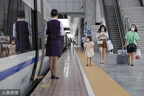 2022年6月10日,旅客在铁路上海站站台上上车。随着上海疫情防控形势持续向好,为进一步适应旅客出行需要,助力复工复产,铁路部门自当日起持续加大长三角地区运力投放力度,重点增加上海地区列车运行班次,逐步实现开车正常化。其中,6月10日上海地区恢复开行旅客列车37列,当天开行列车总数达106列。 中新社记者 殷立勤 摄