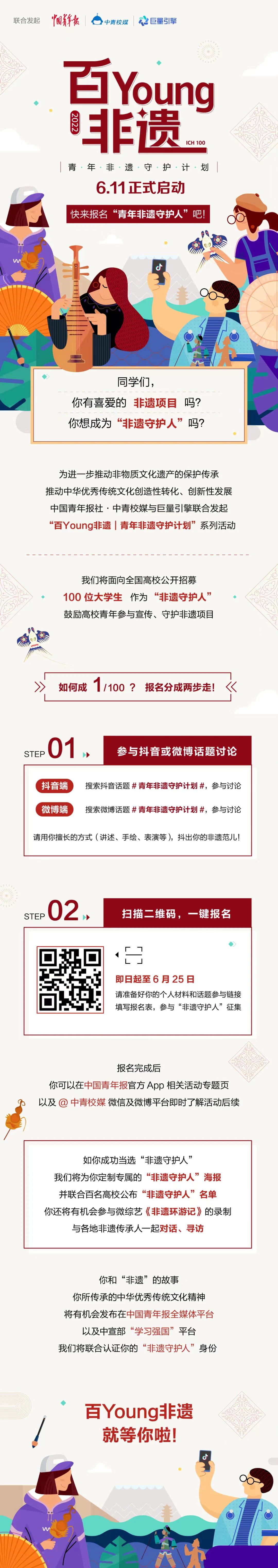 中国青年报客户端讯(中青报·中青网见习记者 刘俞希)6月11日,“百Young非遗——青年非遗守护计划”正式启动,该计划由中国青年报社、中青校媒联合巨量引擎共同发起。计划将面向全国高校公开招募100位大学生作为“非遗守护人”,创作以非遗为主题的融媒体作品,并将联合全国各地非遗传承人及爱好者共同为非遗守护发声。