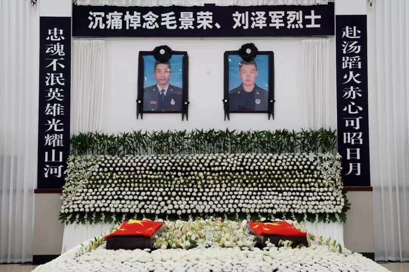 6月13日上午10时,毛景荣烈士、刘泽军烈士遗体告别仪式在杭州市临平区殡仪馆千秋厅举行。