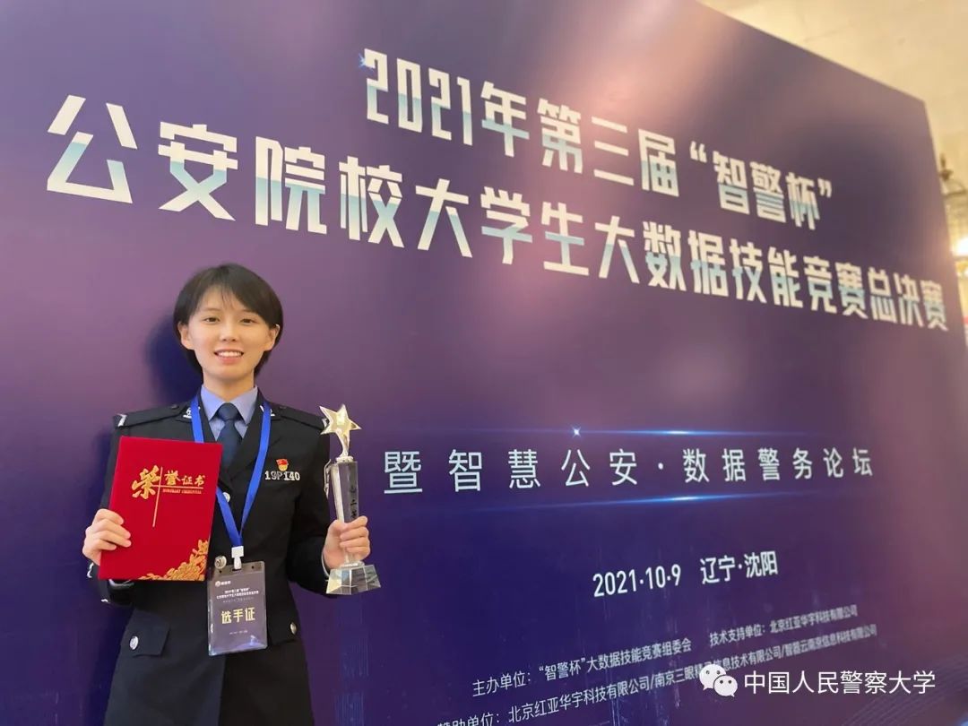 个人简介: 张千一,2019级智慧警务学院三队学生,现任智慧警务学院团委学生副书记、智慧警务三队学习委员。连续两年取得综合成绩专业第一名,连获2次国家奖学金,2次校级特等奖学金,曾获第三届“智警杯”公安院校大学生大数据技能竞赛二等奖、2021年全国高校商务翻译(英语)能力挑战赛特等奖等国家级竞赛奖项7项,省级竞赛奖项3项,校级奖项5项,曾获评“省级三好学生”“自强自立之星”“优秀共青团干部”等荣誉称号,因工作突出荣获个人嘉奖1次,在实习任务中因表现突出荣立个人三等功1次。