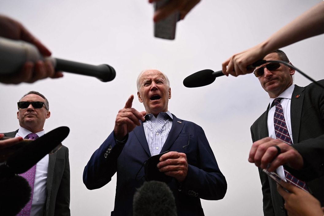 6月11日,美国洛杉矶,参加美洲峰会后,美国总统拜登在洛杉矶国际机场与媒体记者交谈。