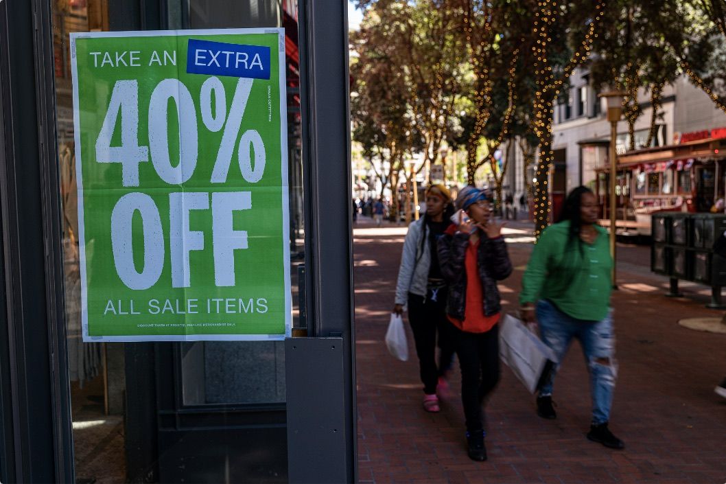 6月1日,美国旧金山,一家商店的橱窗上贴着促销标志。根据密歇根大学的报告,美国6月消费者信心指数跌至50.2,创下历史新低。