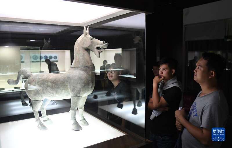 在广西北海市合浦县汉代文化博物馆,游客在参观展出的西汉铜马(2018年10月23日摄)。新华社记者 陆波岸 摄