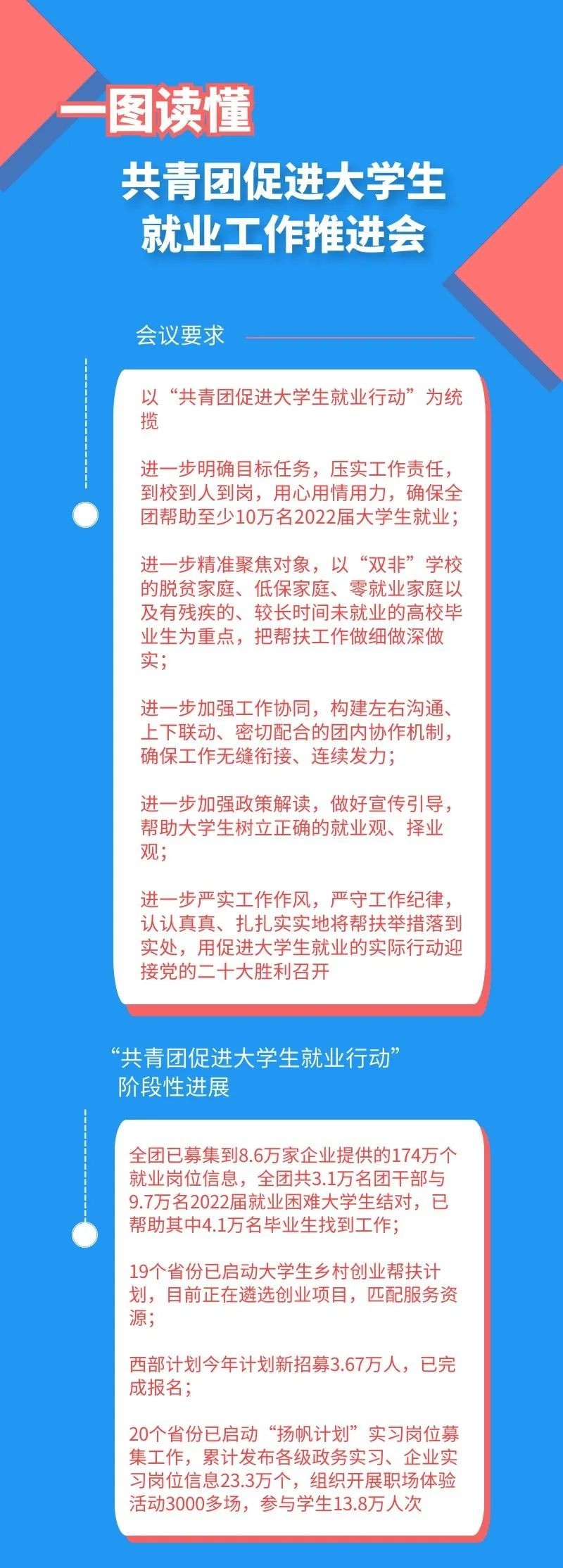 据悉,自“共青团促进大学生就业行动”去年年底启动以来,一般院校低收入家庭学生就业帮扶计划、大学生乡村创业帮扶计划、大学生志愿服务西部计划、大学生实习“扬帆计划”、大学生社区实践计划稳步推进,取得阶段性进展。截至目前,全团已募集到8.6万家企业提供的174万个就业岗位信息,全团共3.1万名团干部与9.7万名2022届就业困难大学生结对,已帮助其中4.1万名毕业生找到工作;19个省份已启动大学生乡村创业帮扶计划,目前正在遴选创业项目,匹配服务资源;西部计划今年计划新招募3.67万人,已完成报名;20个省份已启动“扬帆计划”实习岗位募集工作,累计发布各级政务实习、企业实习岗位信息23.3万个,组织开展职场体验活动3000多场,参与学生13.8万人次。