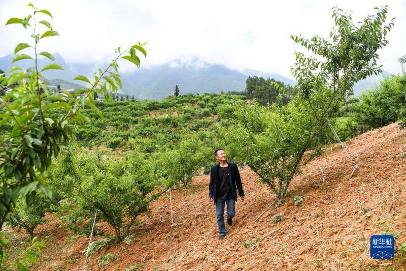 5月19日,重庆市巫山县曲尺乡权发村村民在查看脆李生长情况。新华社记者 王全超 摄
