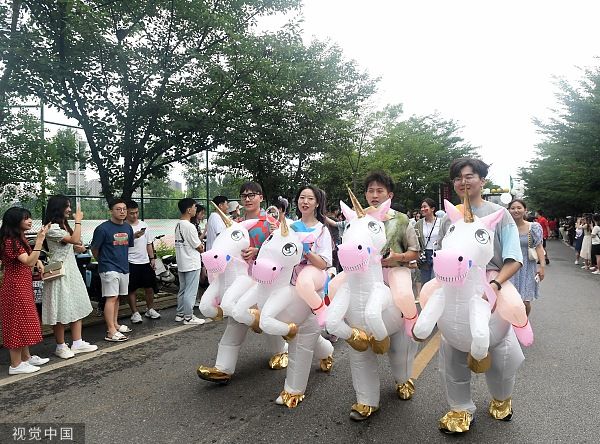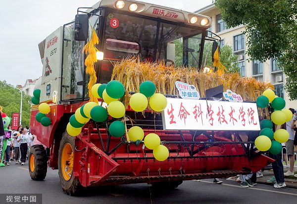 2022年6月19日,武汉,华中农业大学应届毕业生在校园巡游展上庆祝毕业。