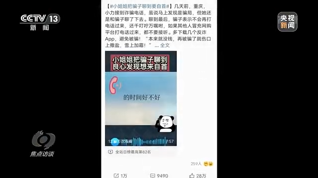 这条新闻,说的是今年3月18日重庆小力姑娘的反诈故事。那天,小力姑娘接到诈骗分子的电话,她不仅戳穿诈骗分子的骗术,还耐心地做起了劝返工作。