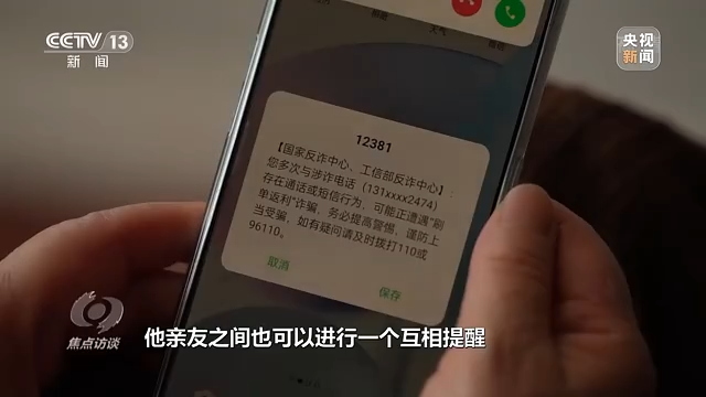 工业和信息化部网络安全管理局局长 隋静:我们在给受话的用户推送预警短信的同时,还给他的亲情号码也同步发送预警短信,他亲友之间也可以进行一个互相提醒,最大限度起到预警劝阻的作用。