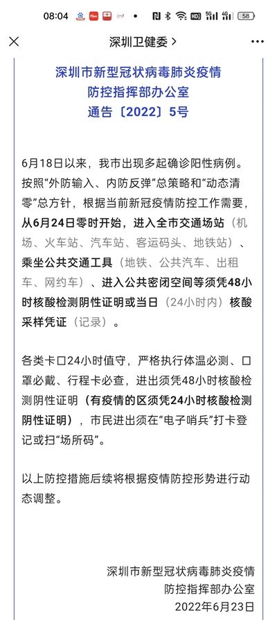 6月23日,深圳市新型冠状病毒肺炎疫情防控指挥部办公室发布通告称,从6月24日零时开始,进入全市交通场站(机场、火车站、汽车站、客运码头、地铁站)、乘坐公共交通工具(地铁、公共汽车、出租车、网约车)、进入公共密闭空间等,须凭48小时核酸检测阴性证明或当日(24小时内)核酸采样凭证(记录)。