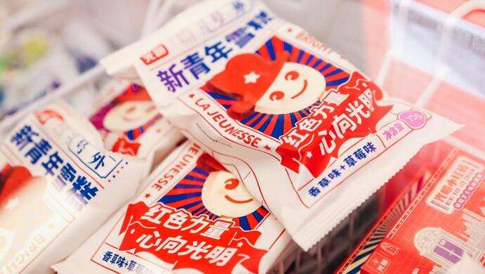 去年7月,光明乳业与中共一大纪念馆共同发布“一大文创”新品,经典的“娃娃雪糕”再次变身,咖啡色礼帽变成红色,体现“红色基因”。棒签上印着寄语新青年的文案,外包装以“新青年”期刊的排版风格搭配五角星、红旗等元素。既有趣又能吃,还能在社交平台晒一晒,新青年雪糕一经上市,就成了热销产品。