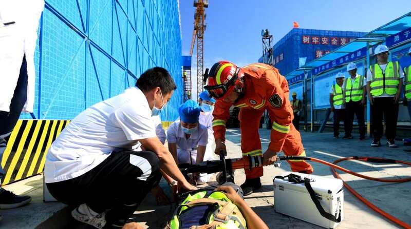 在组长指挥下,工作人员迅速封锁施工现场,设置安全警戒区域保护事故现场。医疗救护组上前将伤者抬出危险区域,对伤者询问伤情、进行治疗。伤者大腿被钢筋刺穿,无法移动,如果处理不当,就会造成二次伤害。现场人员协同专业救护人员将伤者抬至救护车送往医院进一步治疗。