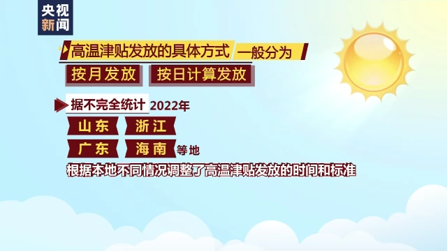 高温津贴发放的具体方式一般分为按月发放或按日计算发放,据不完全统计,今年山东、浙江、广东、海南等地根据本地不同情况调整了高温津贴发放的时间和标准: