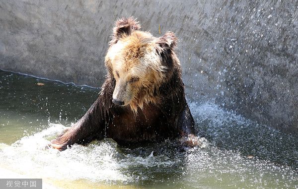 2022年6月25日,在山东省潍坊金宝乐园,一头熊在水中享受清凉。
