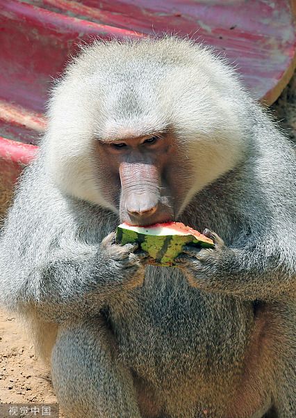 2022年6月25日,在山东省潍坊金宝乐园,狒狒正在品尝清凉的西瓜。