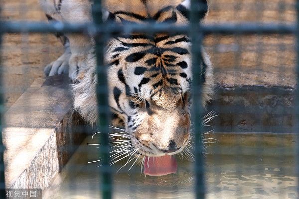 2022年6月25日,在山东省潍坊金宝乐园,老虎正在喝水降温。