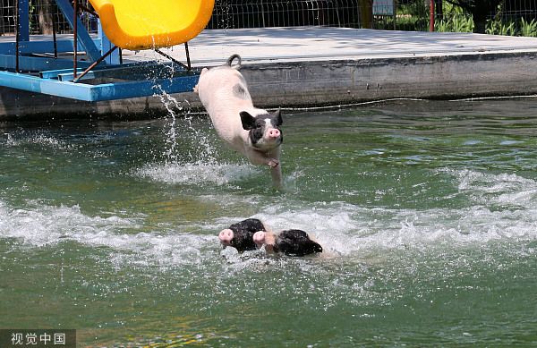 2022年6月25日,在山东省潍坊金宝乐园,小猪畅游水中享受清凉。
