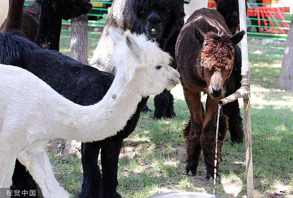 2022年6月25日,在山东省潍坊金宝乐园,羊驼准备喝水。