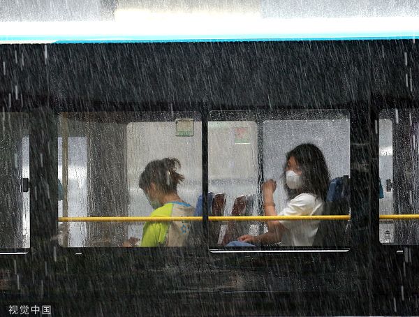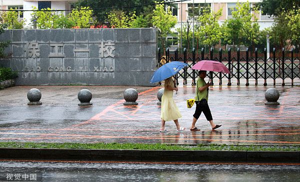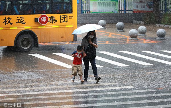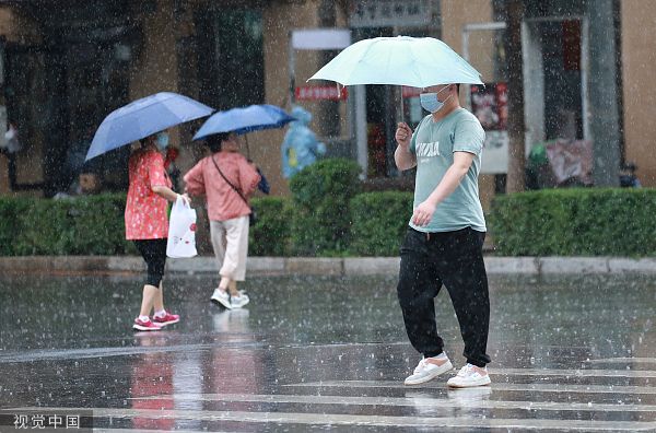 2022年6月27日,沈阳迎来强降雨,市民冒雨出行。当地为保障中小学生安全,全市中小学校停课一天、幼儿园停园一天。