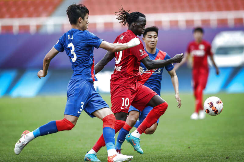 6月29日,上海海港队球员恩迪亚耶(中)带球突破。新华社记者潘昱龙摄