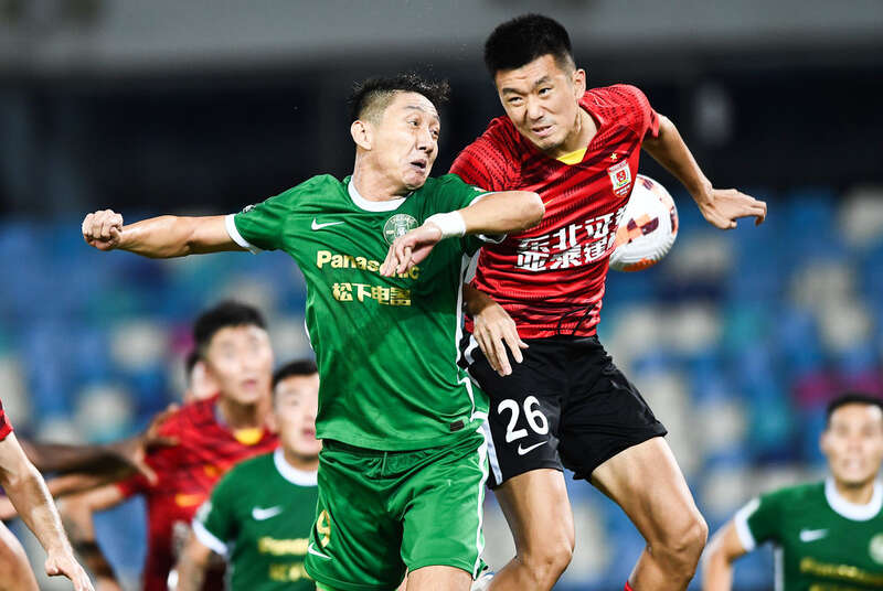 6月29日,长春亚泰队球员董洪麟(右)与浙江队球员高迪在比赛中争顶。新华社记者杨冠宇摄