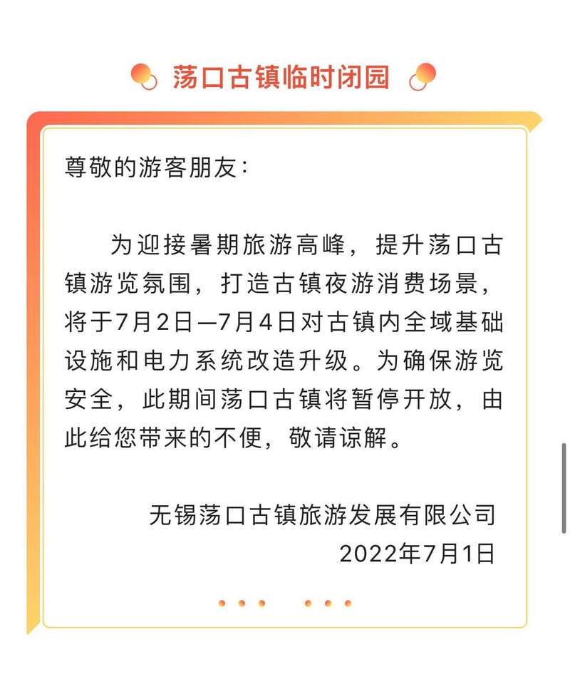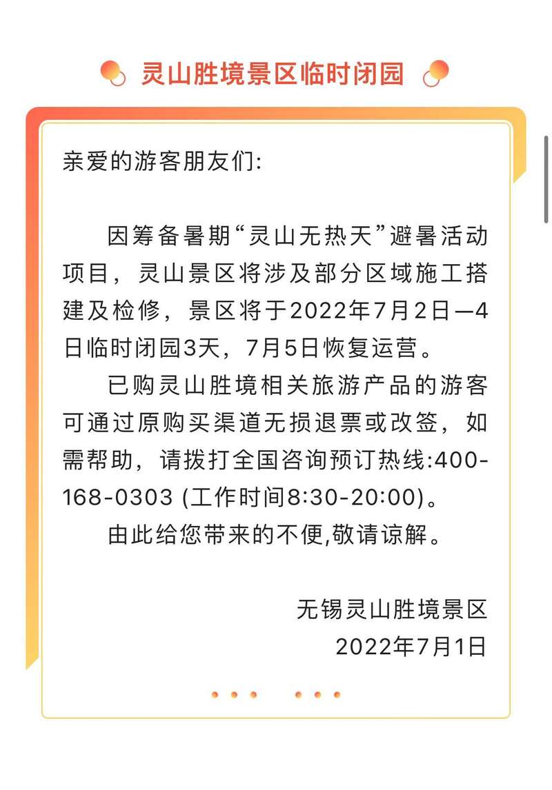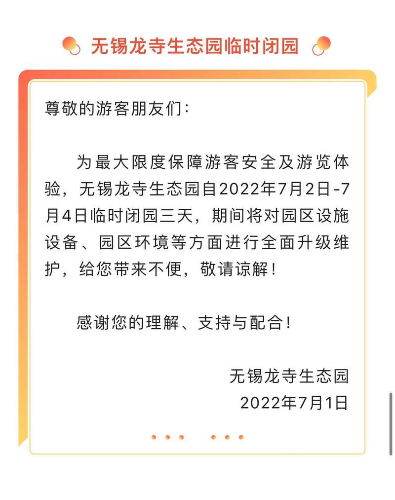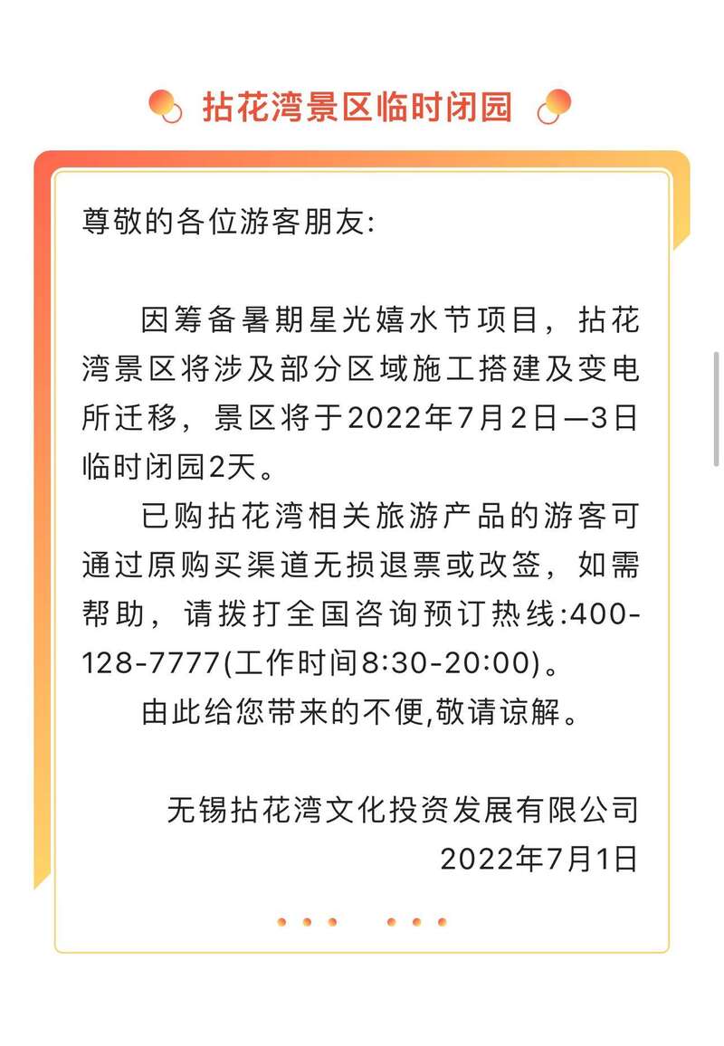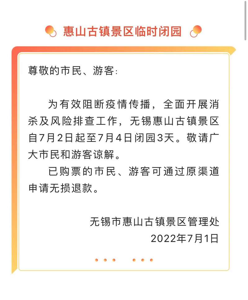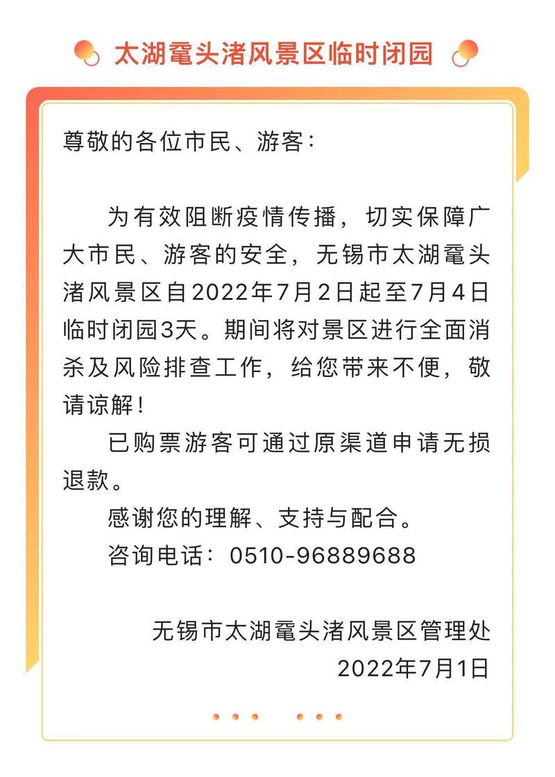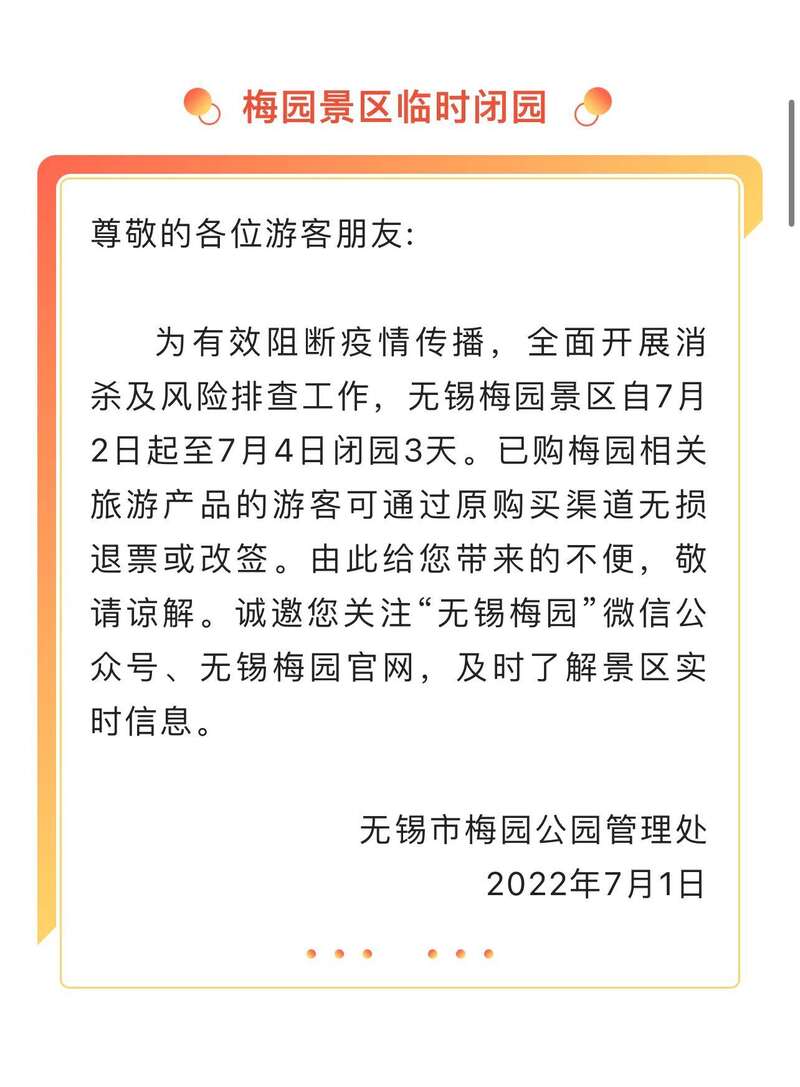 7月1日,江苏无锡太湖鼋头渚风景区、惠山古镇景区、梅园景区等多家景区发布临时关闭通知。