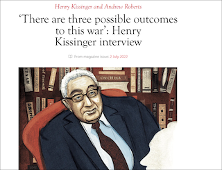 在英国《旁观者》杂志(The Spectator)7月2日刊登的专访中,基辛格指出,如果俄罗斯保持现状,这将是俄罗斯的胜利。而如果冲突持续下去,很可能出现与俄罗斯本身“开战”的情况。基辛格再次强调将战线恢复至冲突开始前,通过谈判解决问题。