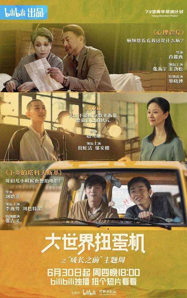 记者了解到,由B站联合坏猴子影业,共同打造的《大世界扭蛋机》系列电影短片于6月23日起正式开播,每周四晚18:00在B站独家上线。本周推出了以“成长之前”为主题的三部短片,未来两周,还将继续推出“爱情之上”、“青春之下”两个主题的多部电影短片。