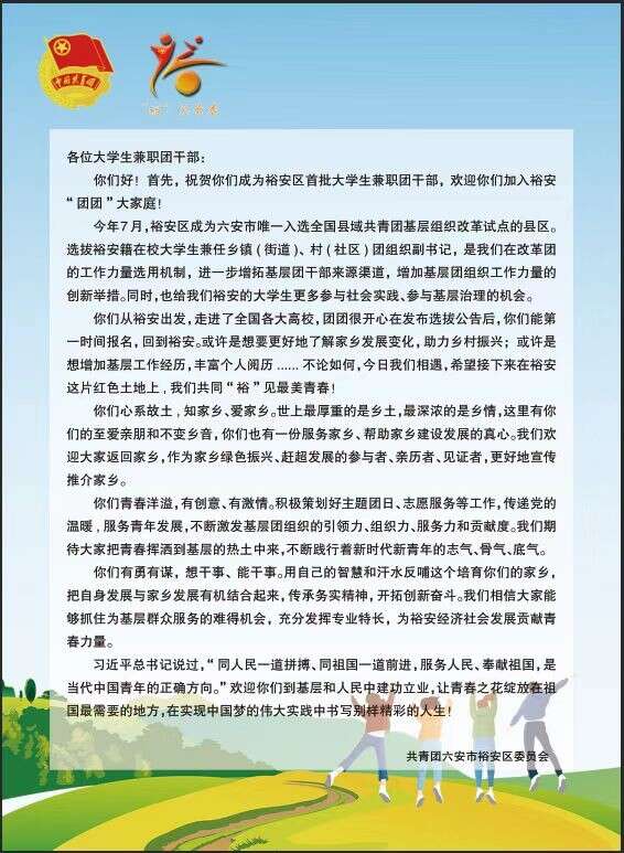 团裕安区委给全区大学生兼职团干部的一封信。团裕安区委供图